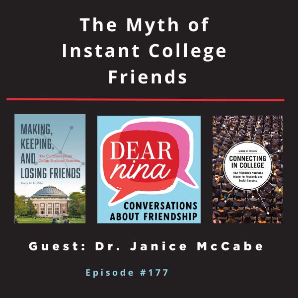 Assuming everyone else has it easierA common sentiment I hear from readers and listeners (whether they’re teens or adults) is some version of this: Everyone else seems to have friends except me. In college, that belief can feel especially brutal starting with choosing “the perfect” roommate, but will get to that in a moment. On a traditional college campus, you’re surrounded by people all the time. You see groups forming quickly. Text threads appear overnight. Groups of floormates walk to every meal together. Everyone seems busy, booked, and socially full right away. And if you’re not immediately part of that, it’s easy to assume you did something wrong, or that you missed your chance, or that you’re the only one you didn’t make “instant friends.” The Myth of Instant College FriendsIn episode 177 of Dear Nina, I spoke with Dartmouth College sociologist, Dr. Janice McCabe, author of two books: Making, Keeping, and Losing Friends: How Campuses Shape College Students Networks and Connecting in College: How Friendship Networks Matter for Academic and Social Success about why the assumption that everyone else has it easier is both powerful and misleading. One of the most grounding ideas we discussed is that friendship is not just about personality, confidence, or effort. It’s also about the structure some college campuses make more approachable than others and taking advantage of those opportunities. We spoke about the research Dr. McCabe has done on friendship markets and how to figure out, as a college student, which markets are “open” and which are “closed.” This is also excellent advice for any stage of life such as moving to a new city or entering a new stage of life, or even when you feel your social life isn’t as strong as you’d like. Here’s the truth about those early college groups you might see forming seemingly overnight: Many of those initial groups are temporary. They shift. They shrink. Some fade entirely by second semester. ALSO: The roommate pressure is out of control these daysNowhere is this “instant friendship” pressure more obvious than with the roommate search that begins senior year of high school. Dr. McCabe and I spoke about the way Dartmouth College still requires random roommate matches with the use of a questionnaire to assess living styles more than anything else. (How late you like the light on, how warm or chilly you like the room, how messy or neat you are.) For most schools nowadays, before college even starts, there’s a scramble to find a roommate via social media or through mutual friends. Students match based on shared “online aesthetics” and the assurance of a similar background. Parents watch this process unfold with a mix of fascination and anxiety. No one wants their kid to be the one who wasn’t chosen. No student wants to feel not chosen. But as Dr. McCabe explains, similarity doesn’t equal compatibility. Liking the same clothes or brand of iced coffee doesn’t tell you whether someone keeps the lights on until 3 a.m., needs quiet to study, or cleans the room once a semester. Yet many students arrive on campus believing their roommate is supposed to become their built-in best friend. That expectation alone can create daily stress. When it works out with your pre-chosen roommate, fantastic. When it doesn’t, students can feel like they failed at friendship before the first weeks have passed. In reality, roommates don’t need to be close friends to be a good match for living together. The ideal is simply a respectful, neutral relationship. That would be an enormous success! No matter your age/stage . . .Friendship is a process. It takes repetition. It takes proximity. It takes trying, recalibrating, and moving on from situations that aren’t working. And yes, it takes longer for some people than others. And it takes longer for almost everyone than enough people are willing to admit. I wish people spoke about this more during college tours! If this feels close to homeIf you’re a parent reading this and you’re worried about a student who seems unhappy after first semester or socially disconnected, I hope this episode offers a little relief. If you’re a student reading this: you didn’t miss your chance. You’re not doing college wrong. And the story you’re telling yourself about how great “everyone else” is doing socially is almost certainly untrue. Listen to episode #177 on Apple, Spotify, YouTube, and anywhere you listen to podcasts! Books, Shows, & Recipes I’m Into These Days
