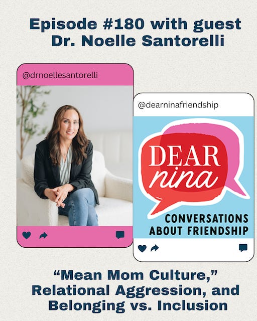 “Forced Inclusion Creates Fragile Belonging”Many of us can remember a friend group we hoped would accept us at some point in our lives. It happens in elementary school, middle school, high school, college, or well into midlife and beyond. Some of us tried far longer than we should have. It usually made sense on paper. Same stage of life. Same neighborhood. Same religion, school, or place of work. At the time, it felt logical to keep trying. If we just showed up more or differently, reached out again, waited a little longer, maybe it would click. Sometimes it didn’t click because people were unkind. And sometimes it didn’t click because it just . . . wasn’t a fit. Both can be true, and telling the difference is harder than we like to admit, especially when it hurts either way. This has been on my mind even more this week after Ashley (Tisdale) French’s essay in The Cut about leaving a “toxic mom group” made the rounds online. The reaction to it has been intense and telling. People seem deeply divided over whether the behavior she described was relational aggression, a slow fade, or simply a group dynamic that no longer worked because of her behavior. The massive reaction highlights how many of us have lived some version of this story. It’s also true that many of us have been on both sides of this story. Someone is clearly trying to be your friend, but something feels off for reasons you can’t fully explain. Or you’ve been friends, but for any number of reasons the friendship has run its course. Does that make you a “mean girl” for not opening yourself up to everyone who shows interest in starting a friendship? Are you a mean girl for not staying friends with every person who has crossed your path no matter how each of you has changed? In this week’s episode of Dear Nina, I was joined by clinical psychologist Dr. Noelle Santorelli, who is an adjust faculty member at Emory Medical School. (And we recorded this a month before Ashley’s essay in The Cut broke the internet.) Dr. Noelle and I talked through the nuances on both sides of this. Her work focuses on relational aggression and covert bullying—and also on the uncomfortable reality that not every friendship is meant to work. One thing that stood out to me is how differently we talk to kids about dating versus friendship. We tell them to take dating slow, trust their gut, and walk away when something doesn’t feel right. But when it comes to friendship, we’re quick to label disinterest as cruelty. When Dr. Noelle said, “Forced inclusion creates fragile belonging,” I made her repeat it. Because that sentence explains so much of what we get wrong. I keep thinking about how much energy we spend trying to be included instead of asking a quieter question: Do I actually feel like myself here? We should not just be wondering, “Am I wanted?” But rather, “Do I want to be here?” Inclusion can be forced. Belonging can’t. For a much more nuanced conversation about all of the above, listen to episode #180 on Apple, Spotify, YouTube, and anywhere you listen to podcasts! If you’re up for it, I’d love to hear from you—not to name names, but to reflect.Was there a group you tried to get into? Books, Shows, Recipes, and Items I’m Into These Days